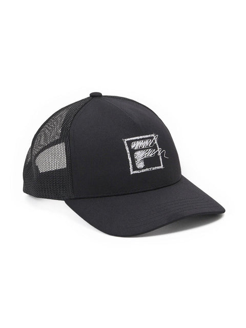Unisex trucker cap in black. Features scribbled Fila logo and snap closure for size adjustment. 100% polyester. One size.