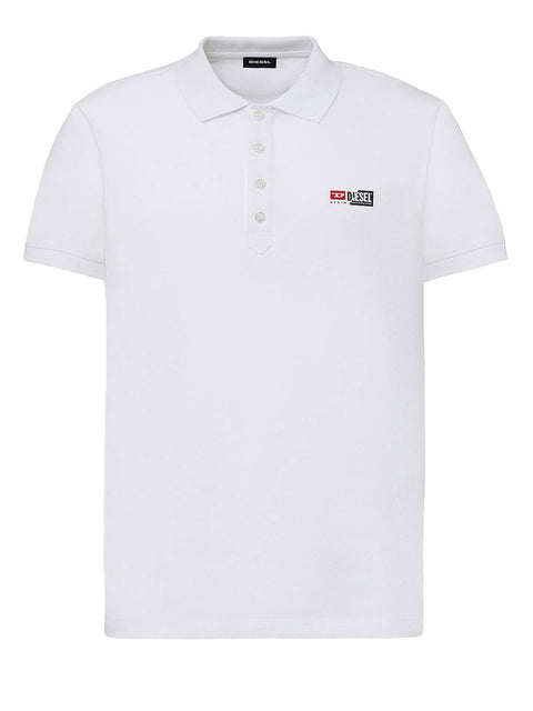 Weißes Poloshirt aus Baumwollpiquet in regulärer Passform. Mit Knopfleiste und Diesel Logo auf der Brust. 100% Baumwolle. Das Model ist 184 cm und trägt Größe M.